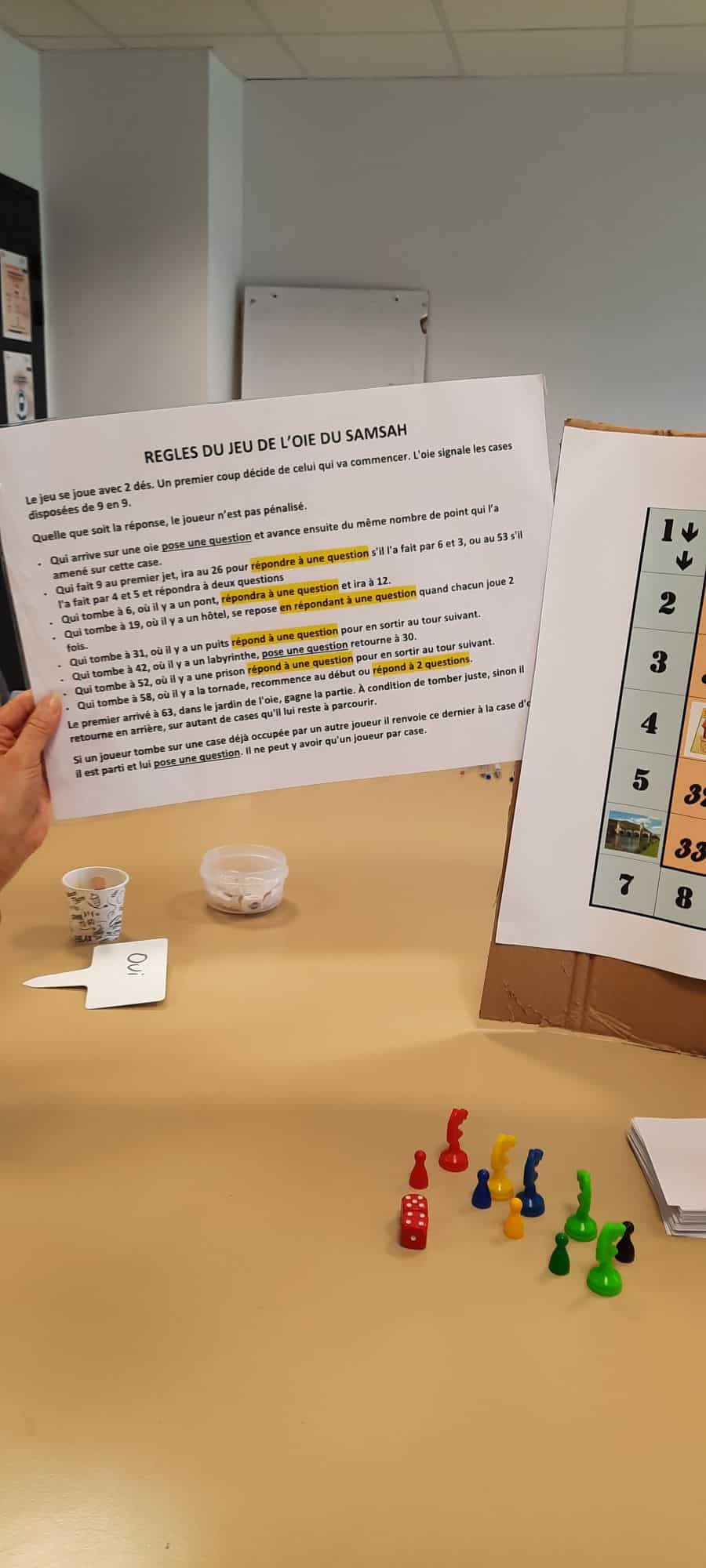 Composé d’un plateau adapté au service, de pions et de dés traditionnels, de carte avec des questions à thème sur la santé, la vie quotidienne, sociale, ou encore les questions sur les accompagnements du SAMSAH, il a été testé lors d’un atelier inter SAMSAH à Labastide Murat il y a quelques jours.